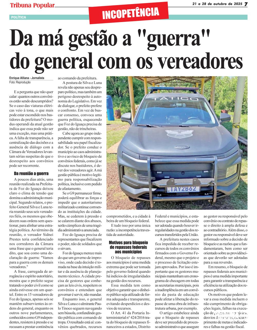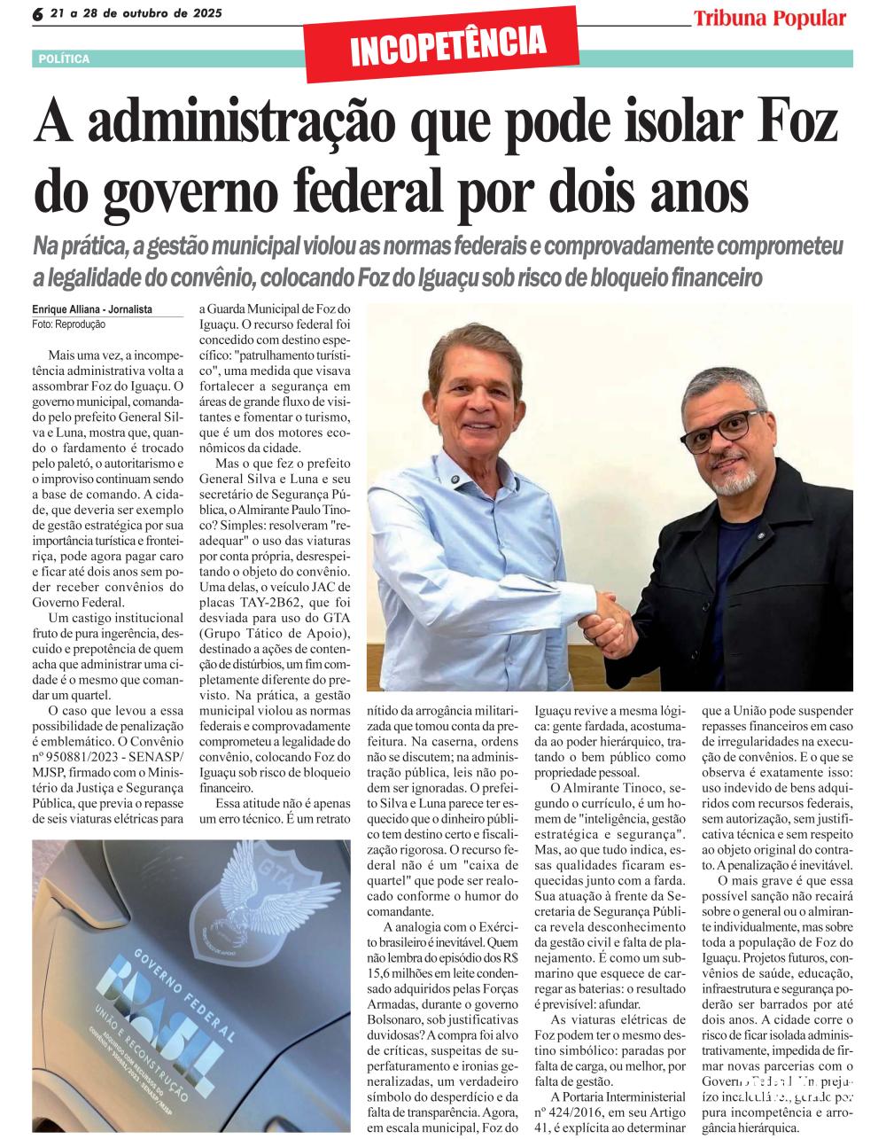 Mais uma vez, a incompetência administrativa volta a assombrar Foz do Iguaçu. O governo municipal, comandado pelo prefeito General Silva e Luna, mostra que, quando o fardamento é trocado pelo paletó, o autoritarismo e o improviso continuam sendo a base de comando. A cidade, que deveria ser exemplo de gestão estratégica por sua importância turística e fronteiriça, pode agora pagar caro e ficar até dois anos sem poder receber convênios do Governo Federal.