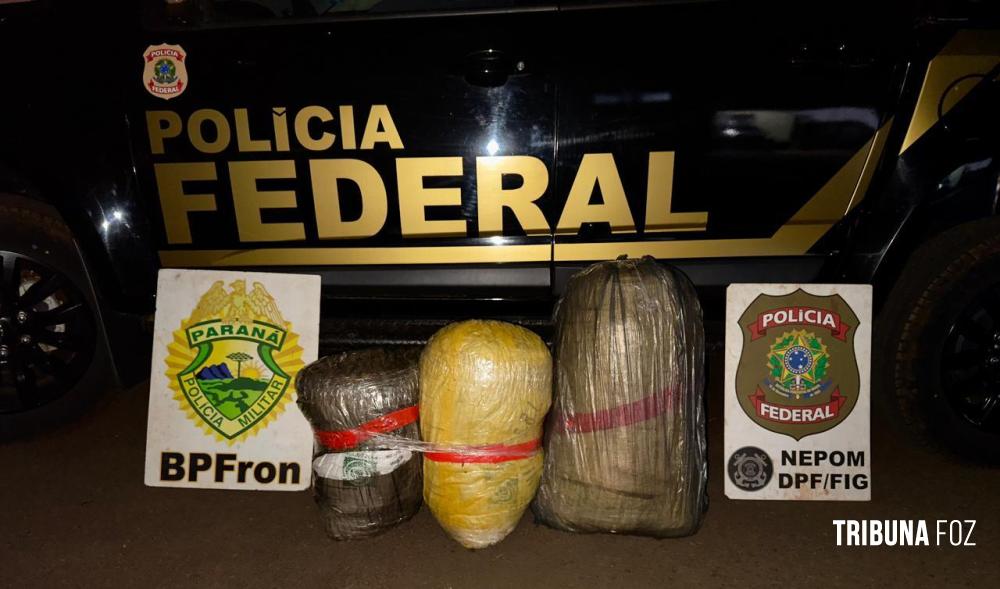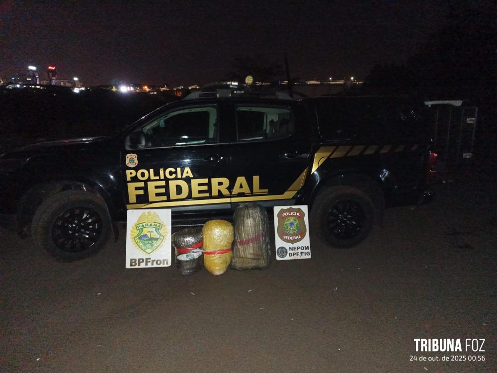 Em uma nova ação conjunta realizada já na madrugada desta sexta-feira (24/10/2025), por volta da 00h:30min, equipes da Delegacia da Polícia Federal de Foz do Iguaçu/PR e da Polícia Militar apreenderam 42 quilos de maconha tipo “capulho” durante patrulhamento na área de fronteira, nas proximidades da Avenida Beira Rio, às margens do Rio Paraná.