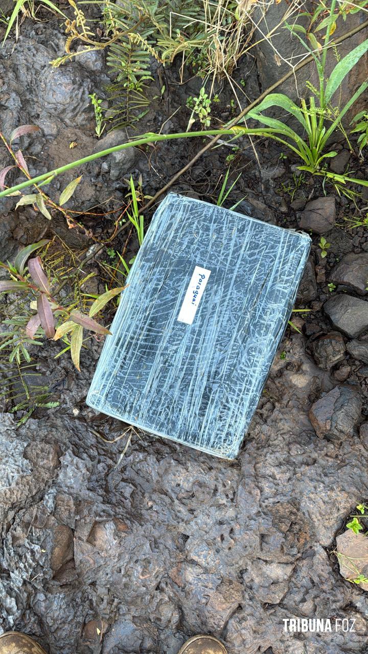 Durante as buscas, os policiais localizaram, em uma trilha próxima ao local, um fardo contendo aproximadamente 7,8 Kg de maconha prensada.