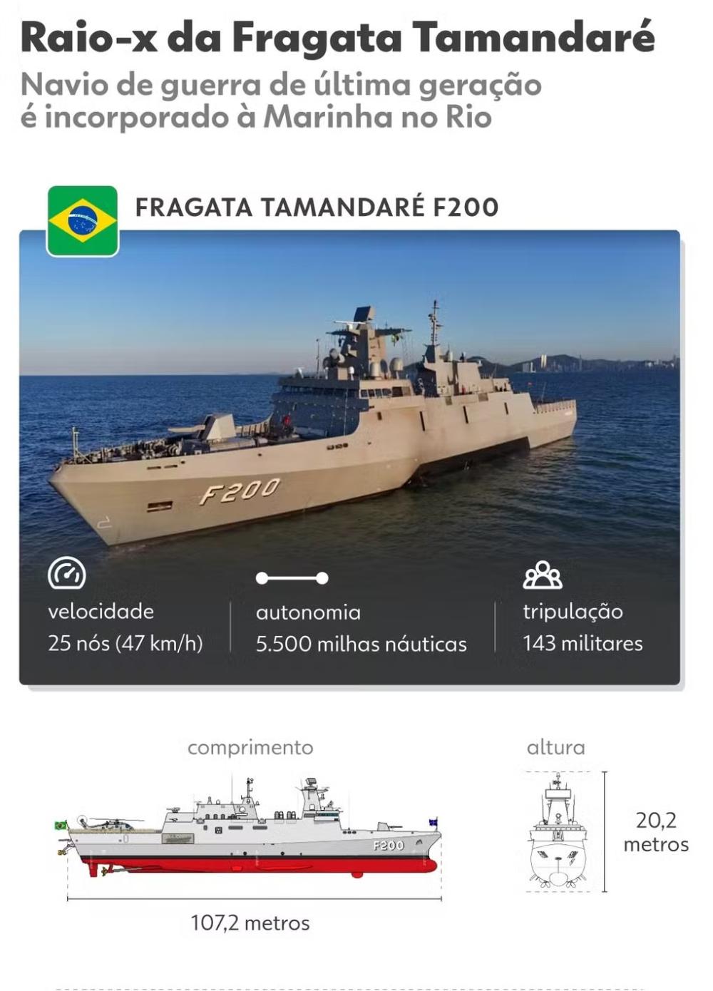 Com uma tripulação de 143 militares, a fragata reúne um conjunto avançado de sensores e sistemas embarcados voltados à vigilância, ao controle do espaço marítimo e à condução de operações navais.