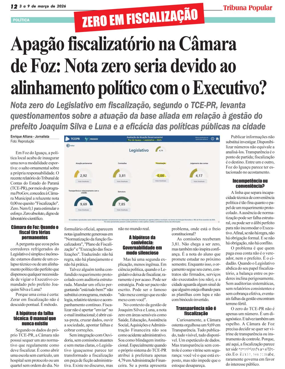 O zero do TCE-PR não é apenas um número. É um diagnóstico. E talvez também um espelho. A Câmara de Foz precisa decidir se quer ser vitrine de transparência ou instrumento de controle. Porque, até aqui, a fiscalização parece ter sido terceirizada ao silêncio. E o silêncio, como se sabe, raramente governa em favor do interesse público.