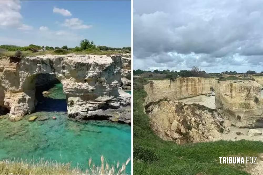 O local era uma das maiores atrações turísticas da península de Salento, no sul do país, e desmoronou no sábado (14/02/2026) após as fortes chuvas que atingem a costa do Adriático.