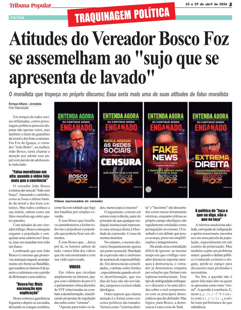 Em tempos de redes sociais inflamadas, certos personagens políticos parecem disputar não apenas votos, mas também o título de guardiões da moral e dos bons costumes. Em Foz do Iguaçu, o vereador "João Bobo", ou melhor, João Bosco, tenta chamar a atenção por adotar esse papel com paixão de adolescente malcriado.