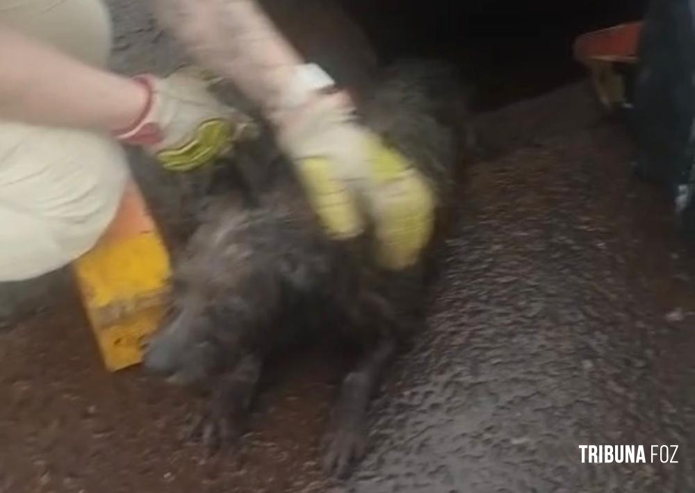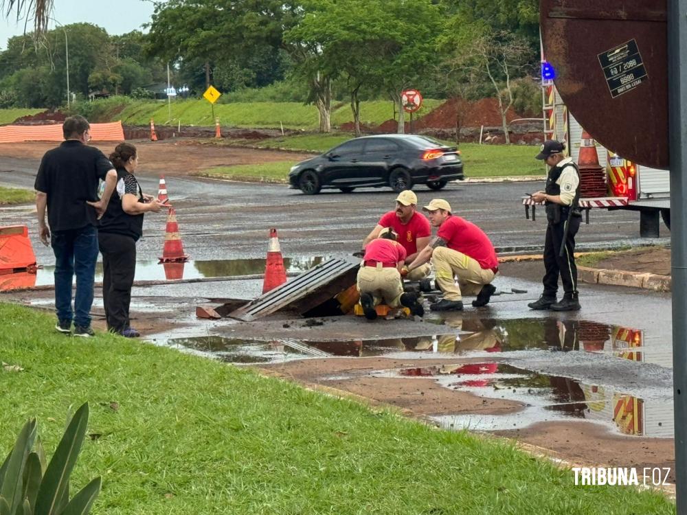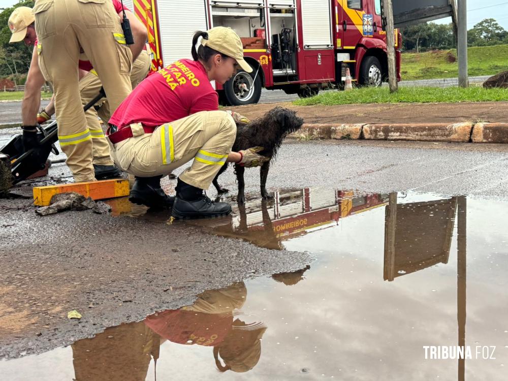 Bombeiros resgatam cachorrinho que caiu em bueiro na aduana brasileira em Foz do Iguaçu