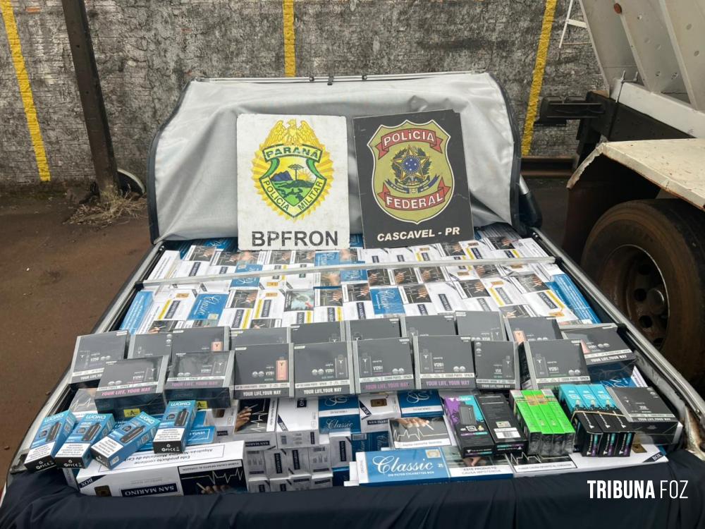 Nesta terça-feira, 30 de setembro de 2025, a Polícia Militar do Paraná, por meio do BPFRON (Batalhão de Polícia de Fronteira), no âmbito da Operação Protetor, em ação conjunta com a Polícia Federal, quando realizavam patrulhamento no município de Céu Azul/PR, quando visualizaram um automóvel estacionado com a suspensão traseira rebaixada. Durante a verificação, com o uso de lanterna, foi possível observar pela janela e pela tampa traseira que o veículo estava carregado de cigarros. Ao abrir o automóvel, a equipe localizou, além dos cigarros, cigarros eletrônicos e uma sacola contendo anabolizantes.