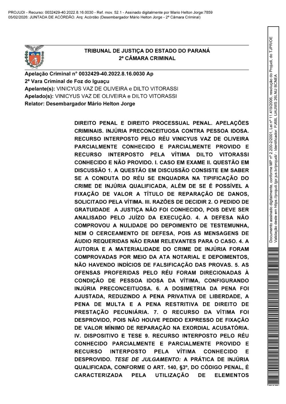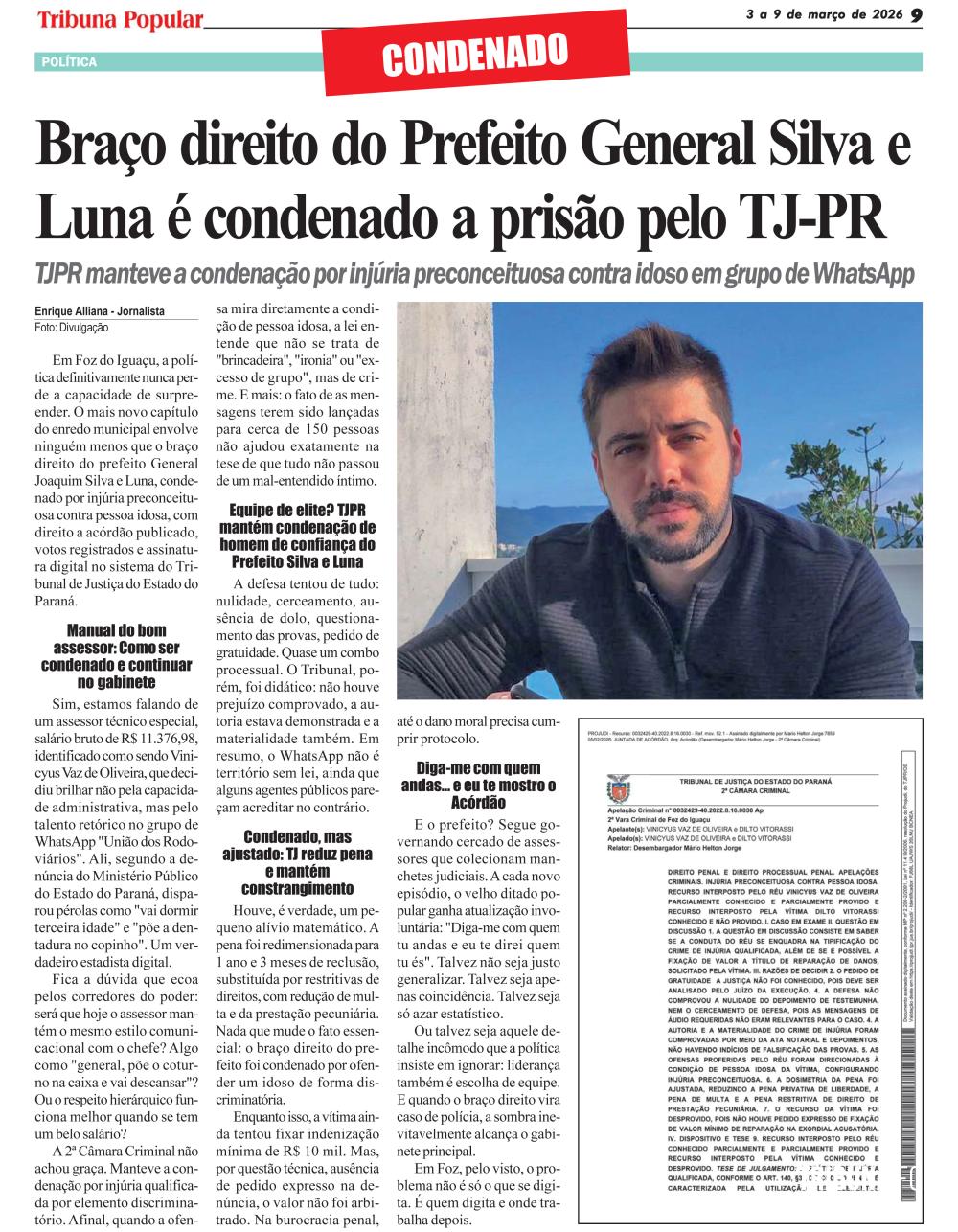 Em Foz do Iguaçu, a política definitivamente nunca perde a capacidade de surpreender. O mais novo capítulo do enredo municipal envolve ninguém menos que o braço direito do prefeito General Joaquim Silva e Luna, condenado por injúria preconceituosa contra pessoa idosa, com direito a acórdão publicado, votos registrados e assinatura digital no sistema do Tribunal de Justiça do Estado do Paraná.