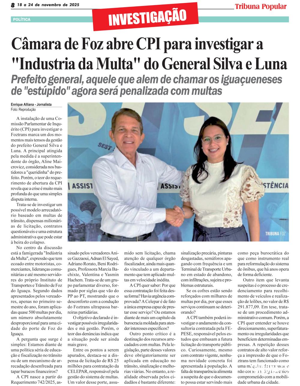 A instalação de uma Comissão Parlamentar de Inquérito (CPI) para investigar o Foztrans marca um dos momentos mais tensos da gestão do prefeito General Silva e Luna. A principal atingida pela medida é a superintendente do órgão, Aline Maicrovicz, considerada nos bastidores a "queridinha" do prefeito. Porém, o teor do requerimento de abertura da CPI revela que a crise é muito mais profunda do que uma simples disputa interna.
