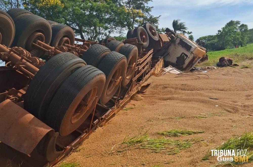 Um caminhão carregado com grãos de soja tombou na manhã de ontem, segunda-feira 22 de dezembro de 2025, na Rodovia Estadual PR-488, em Diamante do Oeste/PR. O acidente foi registrado no Km 45 da via, no trecho que liga os municípios de Diamante do Oeste e Santa Helena.
