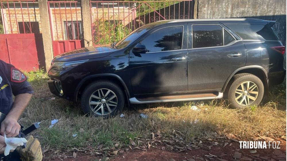 O veículo roubado é uma Toyota / Fortuner, de cor preta, ano 2020, placas paraguaias AAED-662, que estava estacionada na rua ao lado da Clínica Le Blanc.