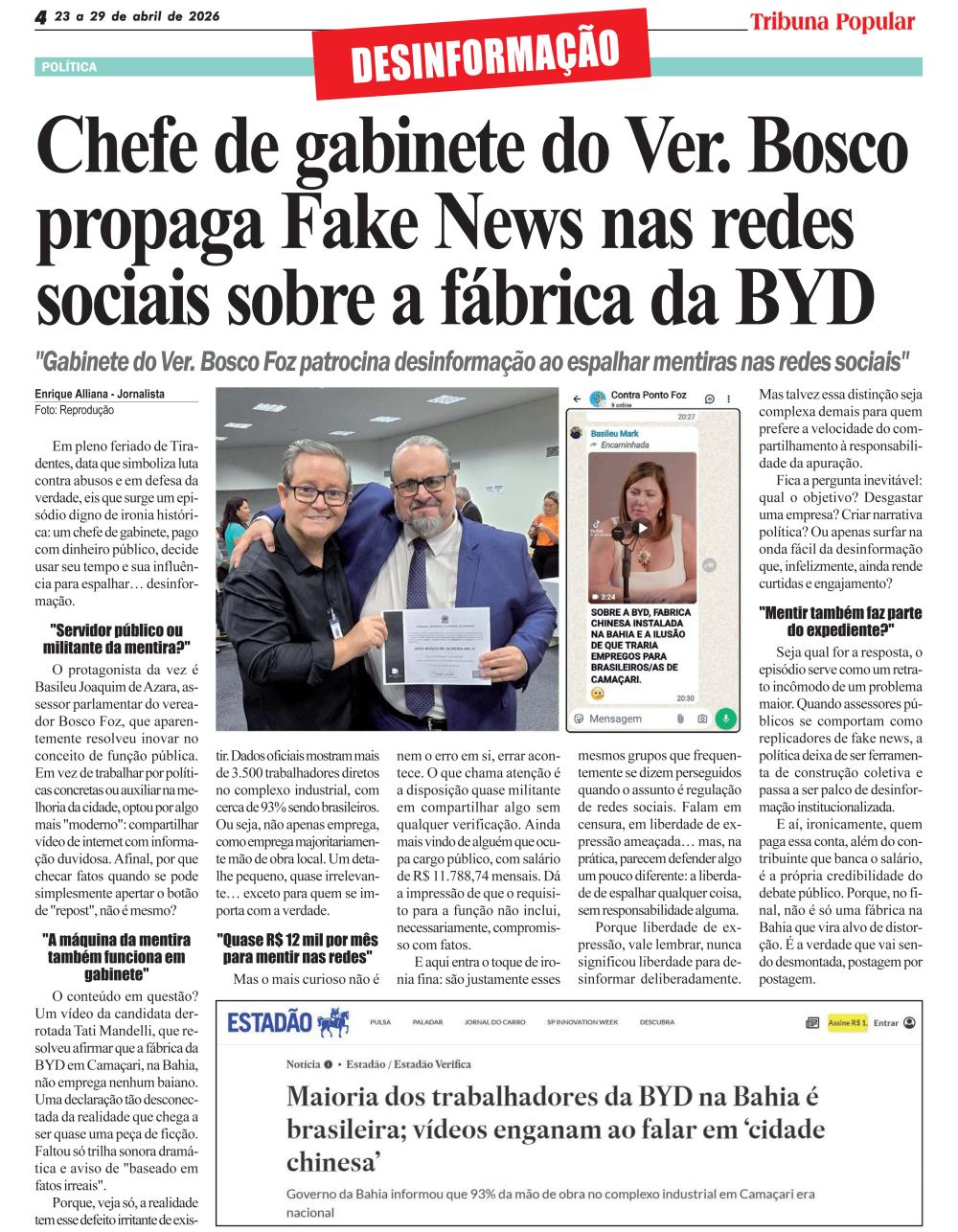 Chefe de gabinete do Ver. Bosco propaga Fake News nas redes sociais sobre a fabrica da BYD