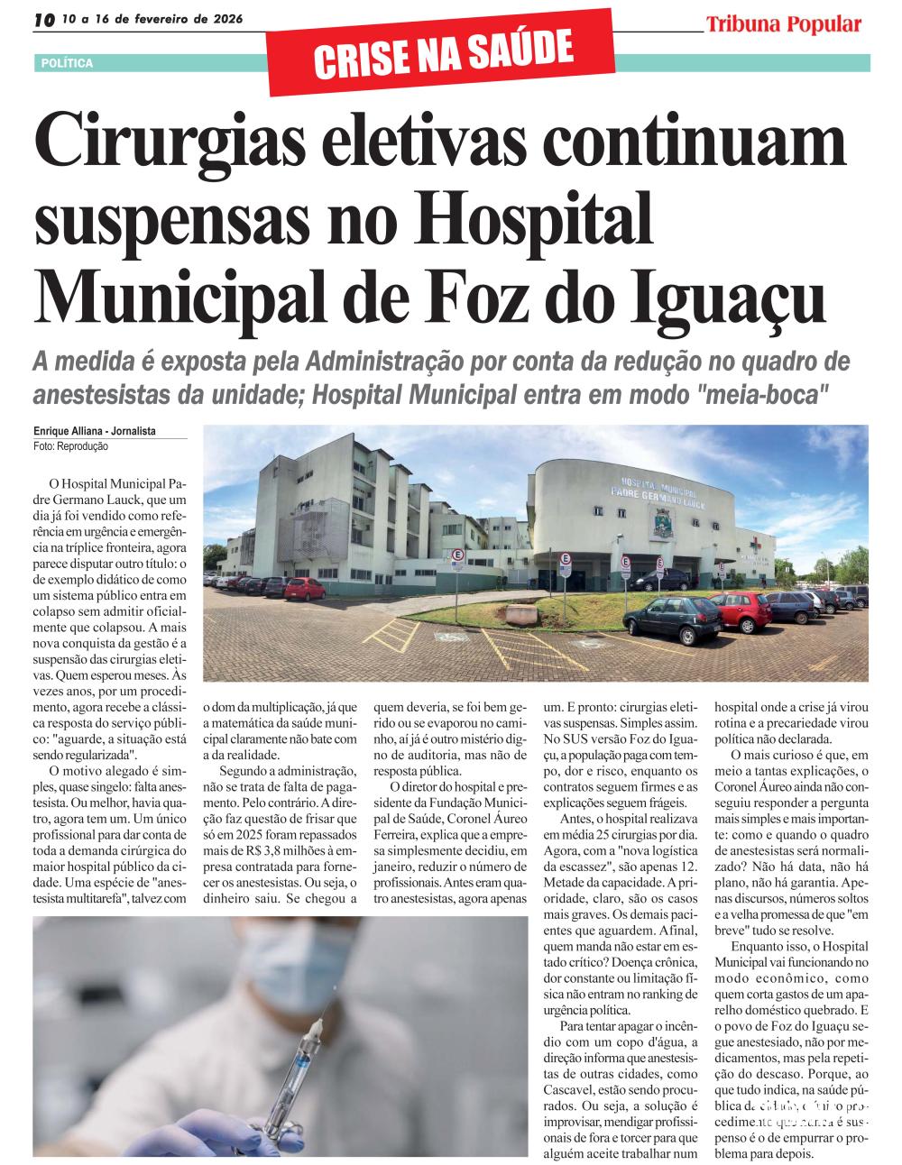 Enquanto isso, o Hospital Municipal vai funcionando no modo econômico, como quem corta gastos de um aparelho doméstico quebrado. E o povo de Foz do Iguaçu segue anestesiado, não por medicamentos, mas pela repetição do descaso. Porque, ao que tudo indica, na saúde pública da cidade, o único procedimento que nunca é suspenso é o de empurrar o problema para depois.