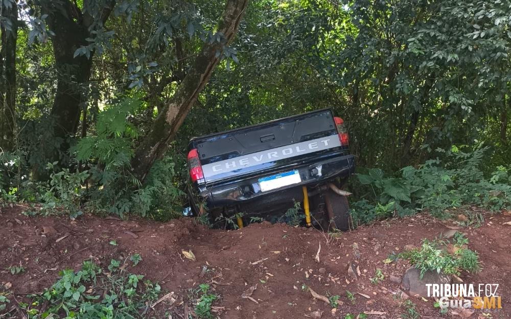 No local, os policiais constataram um automóvel estacionado com sinais de colisão. Cerca de duas quadras adiante, próximo a um rio, foi localizada uma caminhonete GM / S10 Advantage entre árvores, sendo contida pela vegetação e impedida de cair no córrego.