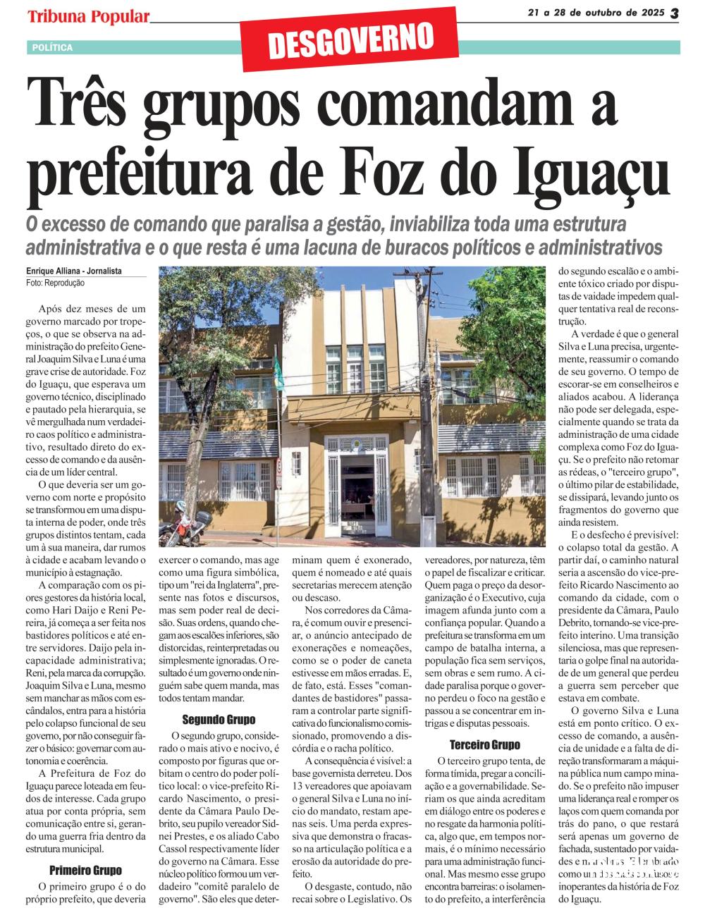 A verdade é que o general Silva e Luna precisa, urgentemente, reassumir o comando de seu governo. O tempo de escorar-se em conselheiros e aliados acabou. A liderança não pode ser delegada, especialmente quando se trata da administração de uma cidade complexa como Foz do Iguaçu. Se o prefeito não retomar as rédeas, o “terceiro grupo”, o último pilar de estabilidade, se dissipará, levando junto os fragmentos do governo que ainda resistem.