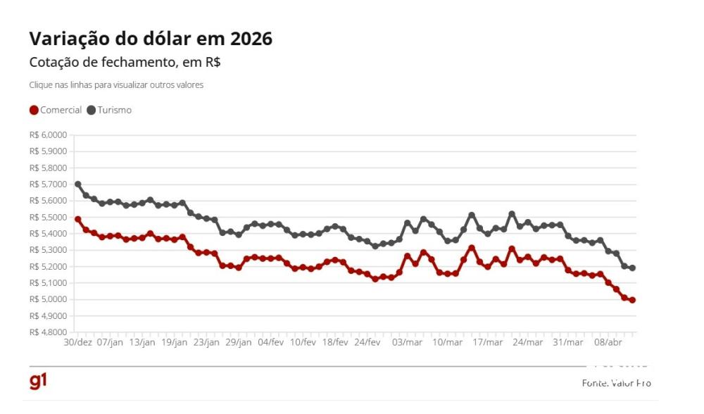 É justamente a busca por ativos fora dos EUA que explica essa maior desvalorização do dólar. No dia de ontem, segunda-feira 13 de abril de 2026, por exemplo, a moeda americana acumulou o 4º dia seguido de queda frente ao real e fechou abaixo dos R$ 5 pela primeira vez em mais de dois anos.