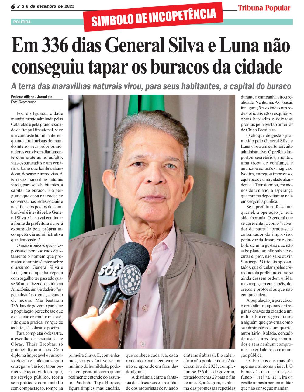 Foz do Iguaçu, cidade mundialmente admirada pelas Cataratas e pela grandiosidade da Itaipu Binacional, vive um contraste humilhante: enquanto atrai turistas do mundo inteiro, seus próprios moradores convivem diariamente com crateras no asfalto, vias esburacadas e um cenário urbano que lembra abandono, descaso e improviso. A terra das maravilhas naturais virou, para seus habitantes, a capital do buraco. E a pergunta que ecoa nas rodas de conversa, nas redes sociais e nas filas dos postos de combustível é inevitável: o General Silva e Luna vai continuar à frente da prefeitura ou será expurgado pela própria incompetência administrativa que demonstra?