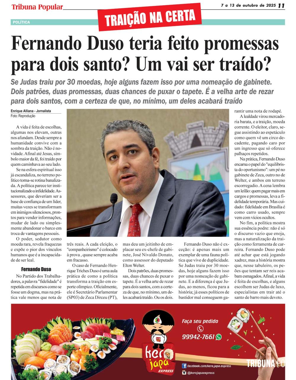Fernando Duso não é exceção: é apenas mais um exemplar de uma fauna política que vive de duplicidade. Se Judas traiu por 30 moedas, hoje alguns fazem isso por uma nomeação de gabinete. E a diferença é que Judas, ao menos, ficou para a história; já esses políticos de bastidor mal conseguem garantir uma nota de rodapé.