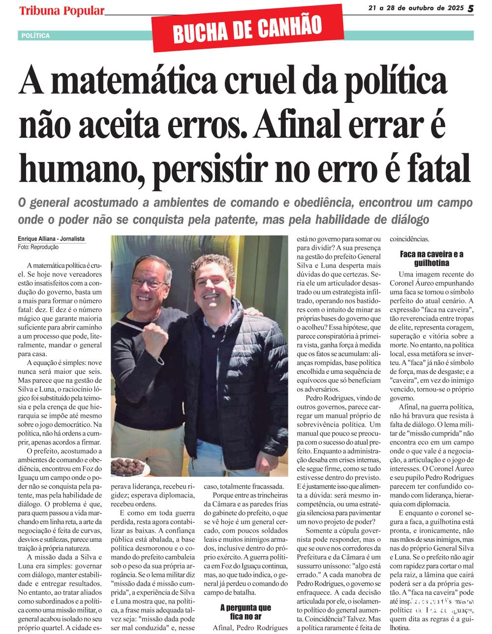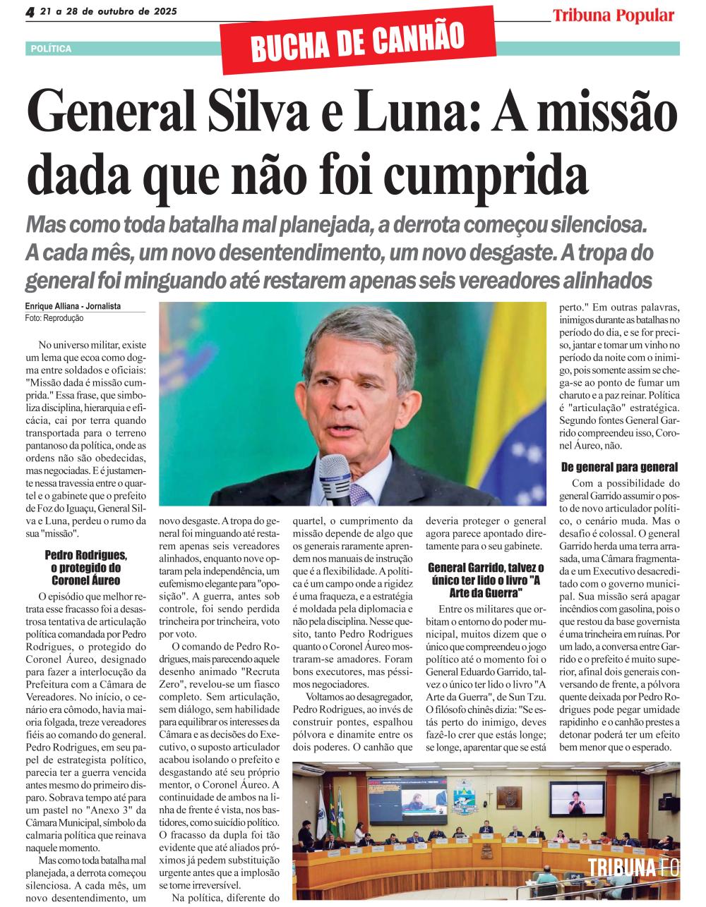 No universo militar, existe um lema que ecoa como dogma entre soldados e oficiais: "Missão dada é missão cumprida." Essa frase, que simboliza disciplina, hierarquia e eficácia, cai por terra quando transportada para o terreno pantanoso da política, onde as ordens não são obedecidas, mas negociadas. E é justamente nessa travessia entre o quartel e o gabinete que o prefeito de Foz do Iguaçu, General Silva e Luna, perdeu o rumo da sua "missão".