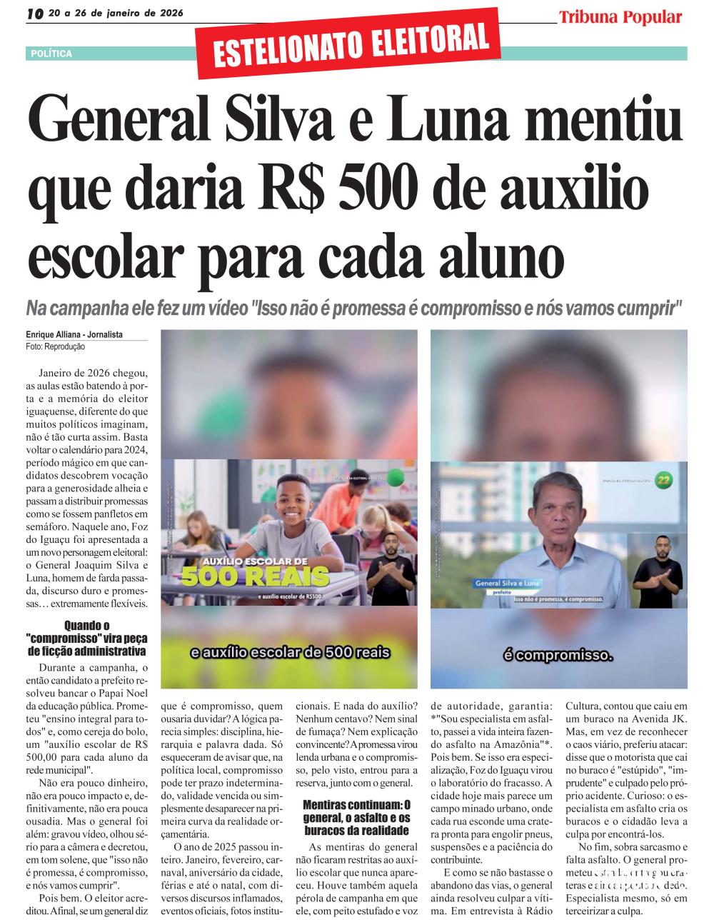 Janeiro de 2026 chegou, as aulas estão batendo à porta e a memória do eleitor iguaçuense, diferente do que muitos políticos imaginam, não é tão curta assim. Basta voltar o calendário para 2024, período mágico em que candidatos descobrem vocação para a generosidade alheia e passam a distribuir promessas como se fossem panfletos em semáforo. Naquele ano, Foz do Iguaçu foi apresentada a um novo personagem eleitoral: o General Joaquim Silva e Luna, homem de farda passada, discurso duro e promessas… extremamente flexíveis.
