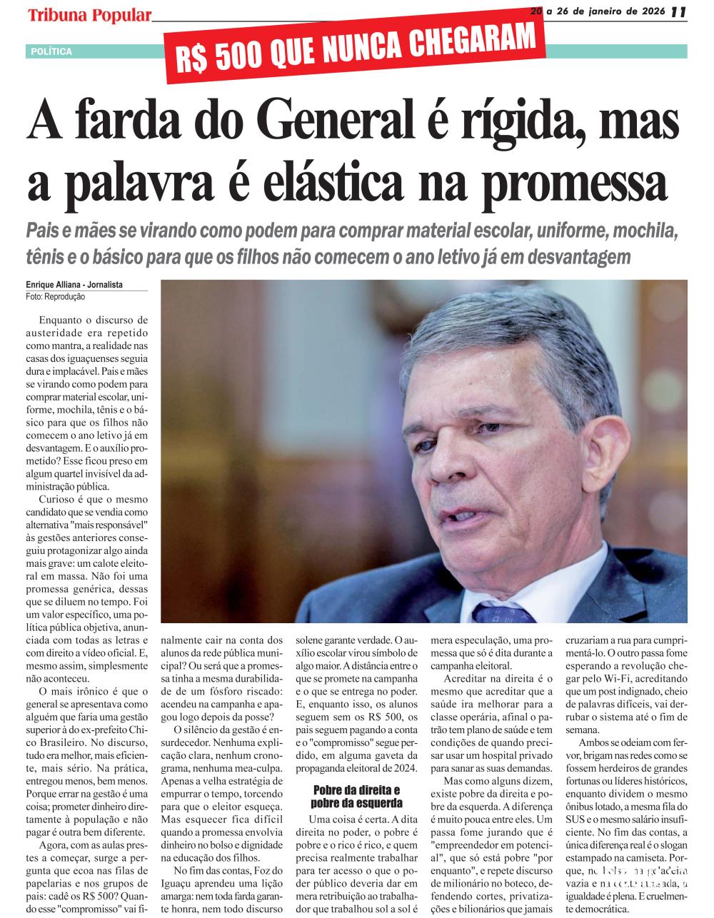 No fim das contas, Foz do Iguaçu aprendeu uma lição amarga: nem toda farda garante honra, nem todo discurso solene garante verdade. O auxílio escolar virou símbolo de algo maior. A distância entre o que se promete na campanha e o que se entrega no poder. E, enquanto isso, os alunos seguem sem os R$ 500, os pais seguem pagando a conta e o "compromisso" segue perdido, em alguma gaveta da propaganda eleitoral de 2024.