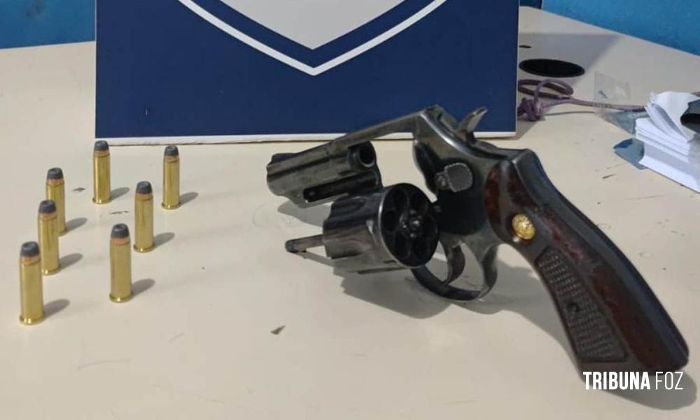 Porem ao realizarem uma revista no interior do veículo foi encontrado um revolver calibre 38, devidamente municiado com seis munições intactas e uma sobresalente.