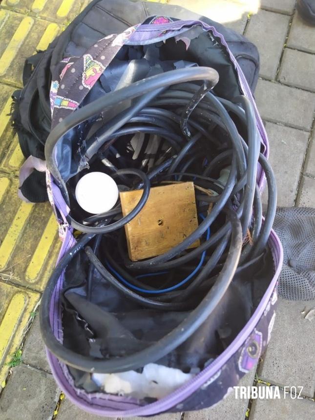 Diante da ocorrência, a equipe do GOT (Grupamento Operacional de Trânsito) da Guarda Municipal foi acionada e deslocou até o local. Nas proximidades, os agentes localizaram um suspeito de 40 anos de idade, identificado por meio das câmeras de videomonitoramento. Durante a abordagem, foi constatado que ele havia furtado aproximadamente 20 metros de fios, que estavam acondicionados em uma mochila.
