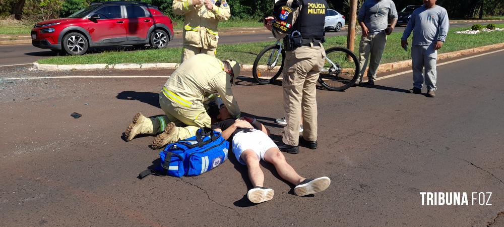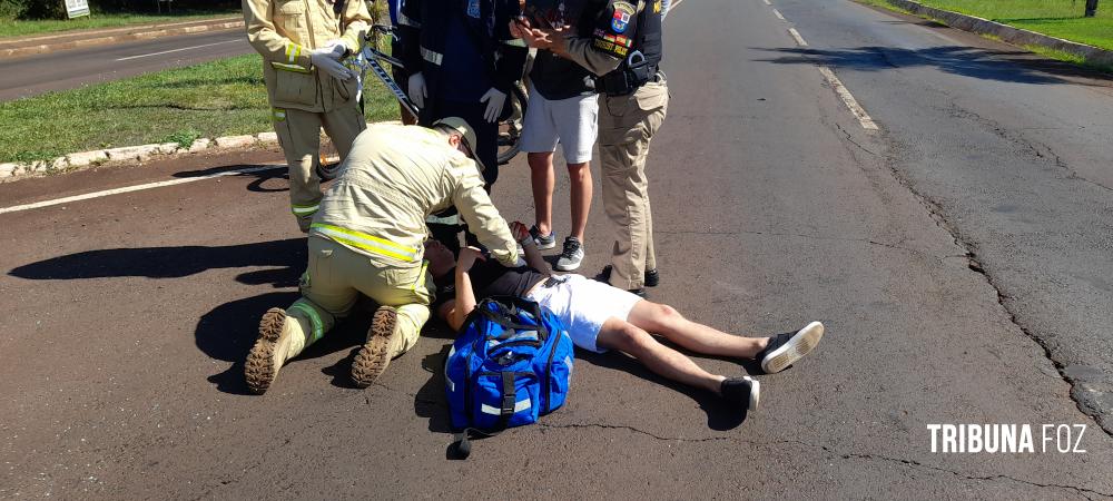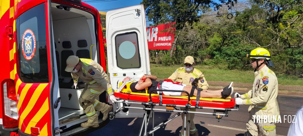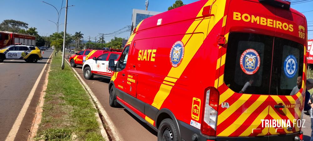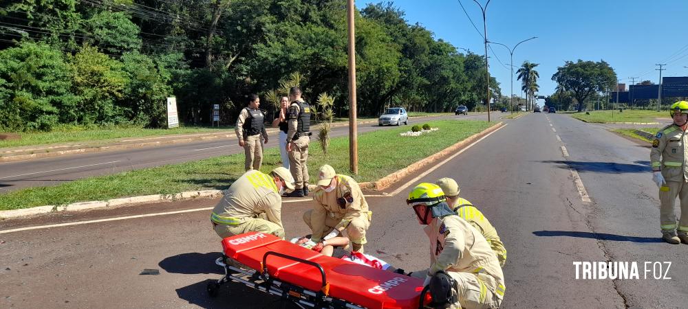 Na manhã deste sábado, 04 de abril de 2026, por volta das 10h:25min, o COBOM (Central de Operações do Corpo de Bombeiros) de Foz do Iguaçu foram acionados pelo telefone de emergência 193, dando conta de um acidente de trânsito envolvendo uma moto de grande porte e um veículo na Avenida das Cataratas, no retorno do Blue Parque.