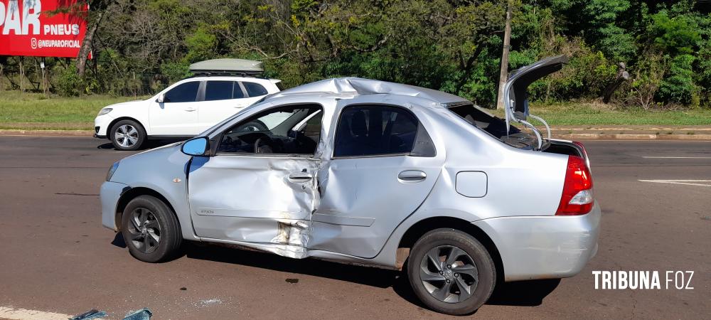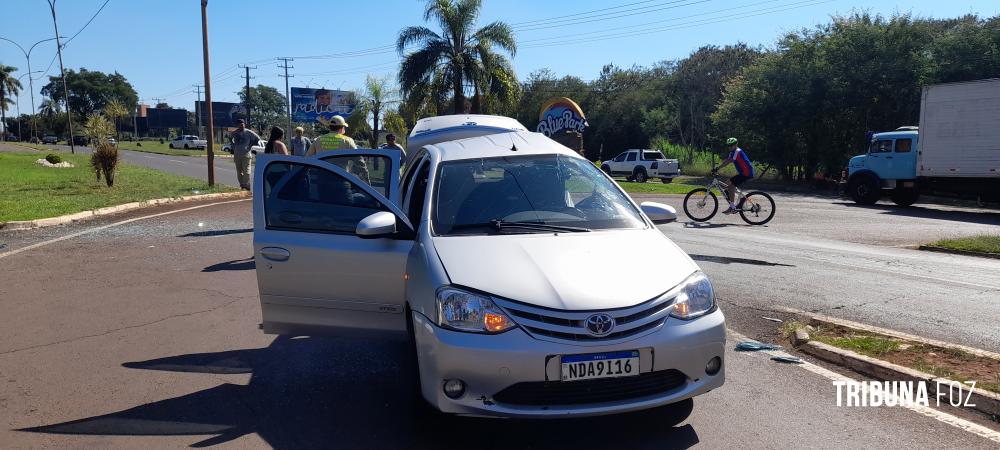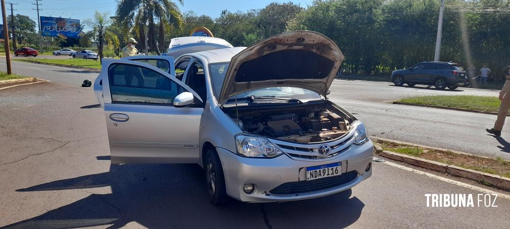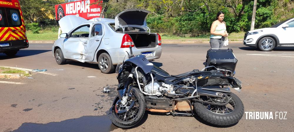 No local, uma equipe da Policia Militar já fazia o controle do trânsito, sendo contatado que a motocicleta BMW / GS F850, de cor preta, que trafegava pela Avenida das Cataratas, teria colidido na porta do veículo Toyota / Etios, de cor prata, que atravessou a preferencial da via.