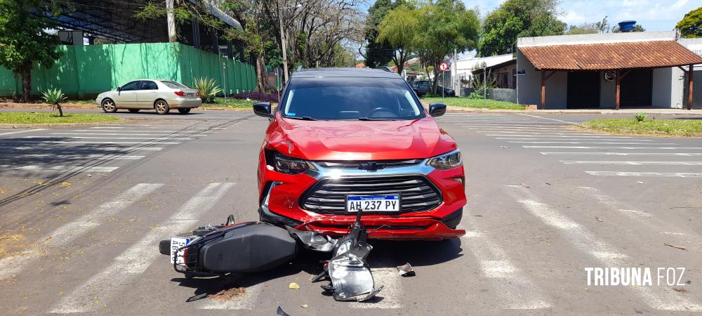 No local foi constatada a colisão envolvendo o veículo GM / Tracker, de cor vermelho, de placas argentinas AH 237 PY e a motocicleta de placa paraguaia 547-ABKC.