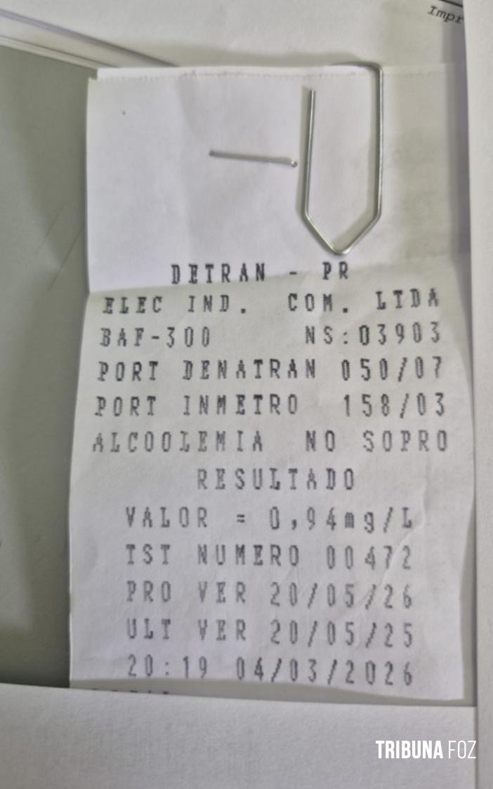 Durante a abordagem, o condutor do Corsa apresentava visíveis sinais de embriaguez. Diante da suspeita, ele foi convidado a realizar o teste do etilômetro, que apontou 0,94 mg/l de álcool por litro de ar alveolar, configurando crime de trânsito.