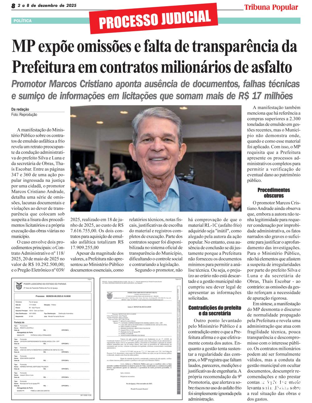 A manifestação do Ministério Público sobre os contratos de emulsão asfáltica a frio revela um retrato preocupante da condução administrativa do prefeito Silva e Luna e da secretária de Obras, Thaís Escobar. Entre as páginas 347 e 360 de uma ação popular ingressada na justiça por uma cidadã, o promotor Marcos Cristiano Andrade, detalha uma série de omissões, lacunas documentais e violações ao dever de transparência que colocam sob suspeita a lisura dos procedimentos licitatórios e a própria execução das obras viárias no município.