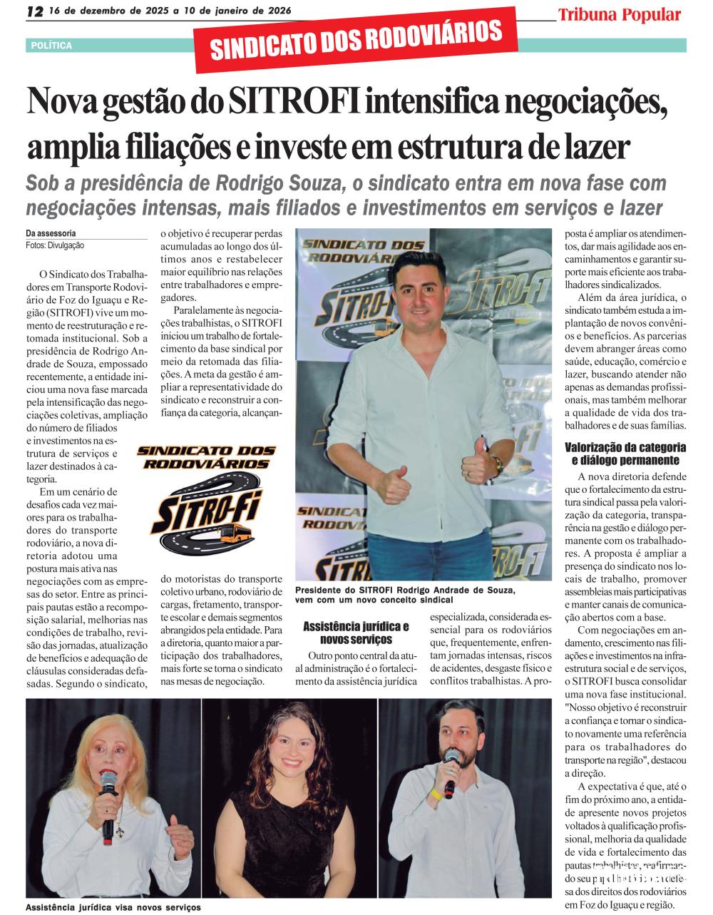 O Sindicato dos Trabalhadores em Transporte Rodoviário de Foz do Iguaçu e Região (SITROFI) vive um momento de reestruturação e retomada institucional. Sob a presidência de Rodrigo Andrade de Souza, empossado recentemente, a entidade iniciou uma nova fase marcada pela intensificação das negociações coletivas, ampliação do número de filiados e investimentos na estrutura de serviços e lazer destinados à categoria.