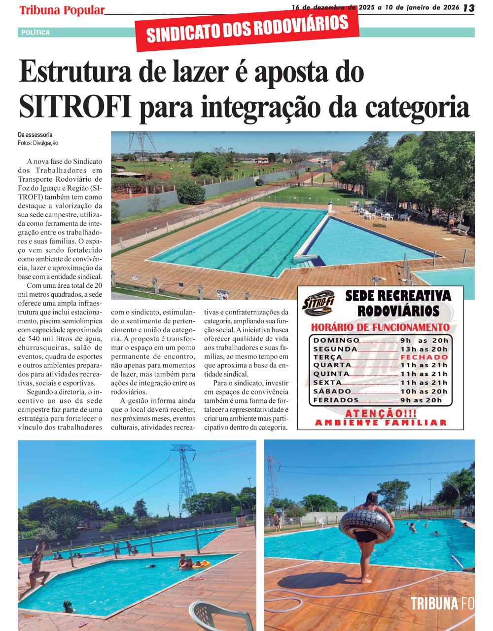 A nova fase do Sindicato dos Trabalhadores em Transporte Rodoviário de Foz do Iguaçu e Região (SITROFI) também tem como destaque a valorização da sua sede campestre, utilizada como ferramenta de integração entre os trabalhadores e suas famílias. O espaço vem sendo fortalecido como ambiente de convivência, lazer e aproximação da base com a entidade sindical.