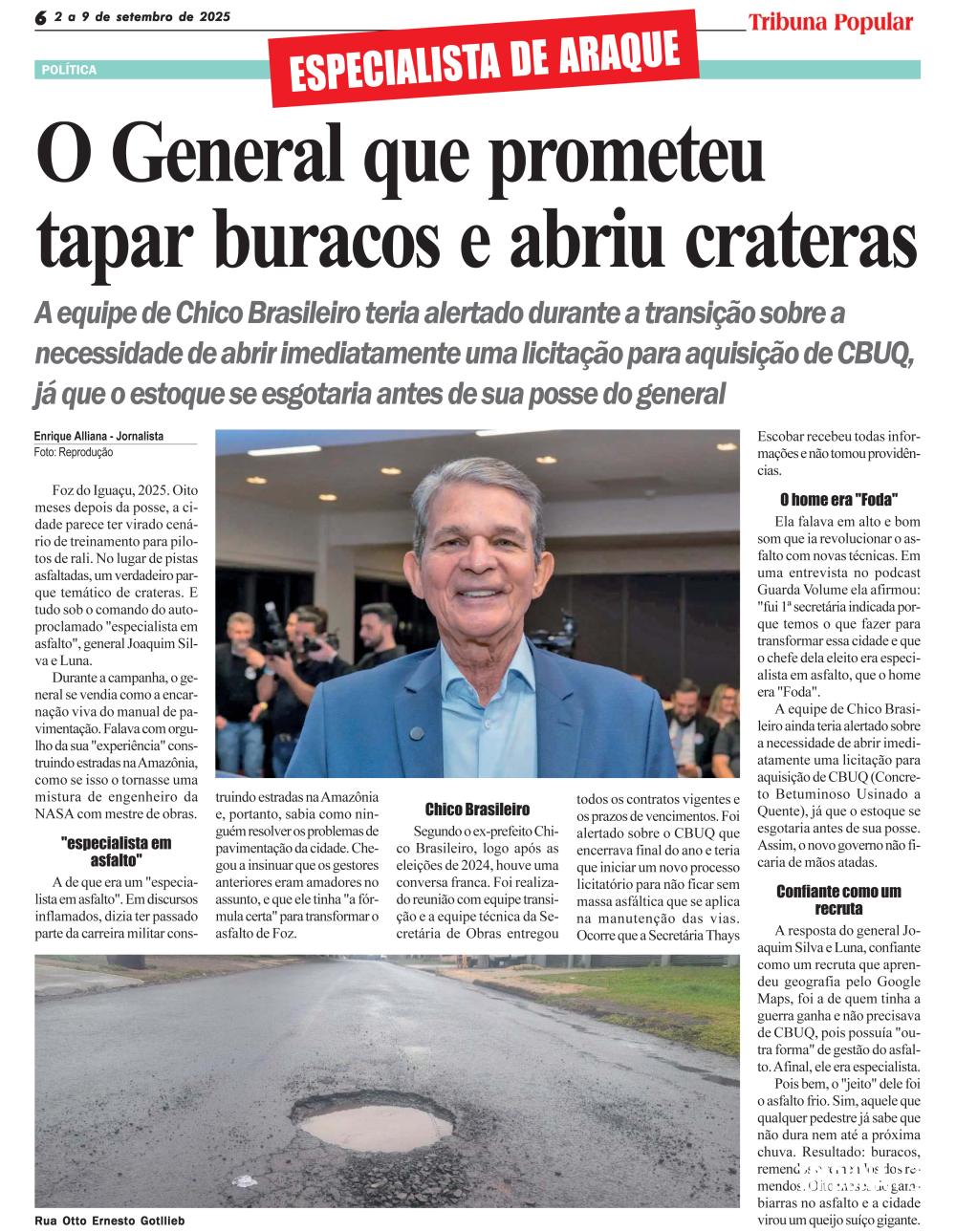 Foz do Iguaçu, 2025. Oito meses depois da posse, a cidade parece ter virado cenário de treinamento para pilotos de rali. No lugar de pistas asfaltadas, um verdadeiro parque temático de crateras. E tudo sob o comando do autoproclamado "especialista em asfalto", general Joaquim Silva e Luna.