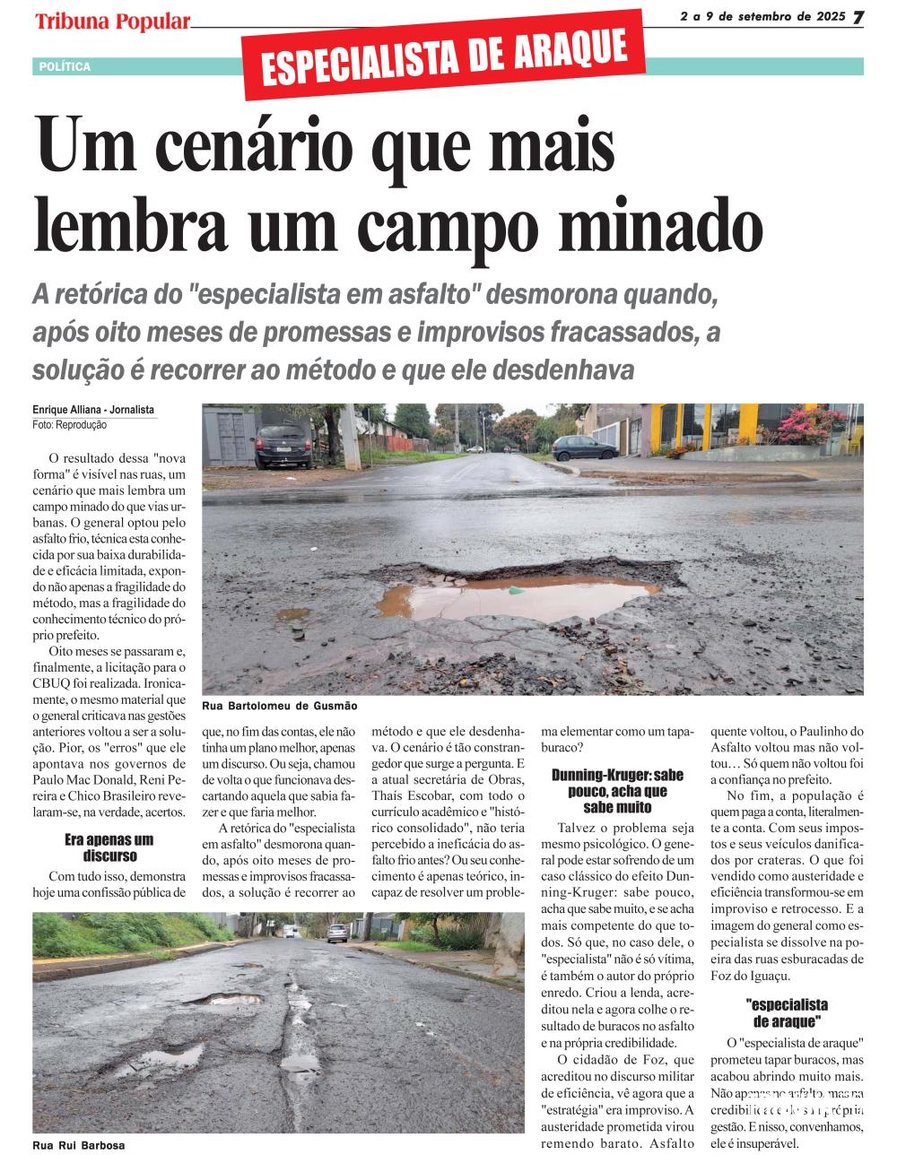 No fim, a população é quem paga a conta, literalmente a conta. Com seus impostos e seus veículos danificados por crateras. O que foi vendido como austeridade e eficiência transformou-se em improviso e retrocesso. E a imagem do general como especialista se dissolve na poeira das ruas esburacadas de Foz do Iguaçu.