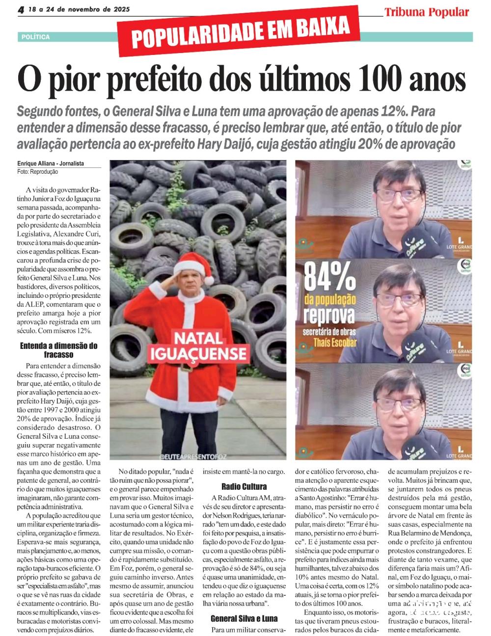 Para entender a dimensão desse fracasso, é preciso lembrar que, até então, o título de pior avaliação pertencia ao exprefeito Hary Daijó, cuja gestão entre 1997 e 2000 atingiu 20% de aprovação. Índice já considerado desastroso. O General Silva e Luna conseguiu superar negativamente esse marco histórico em apenas um ano de gestão. Uma façanha que demonstra que a patente de general, ao contrário do que muitos iguaçuenses imaginaram, não garante competência administrativa.