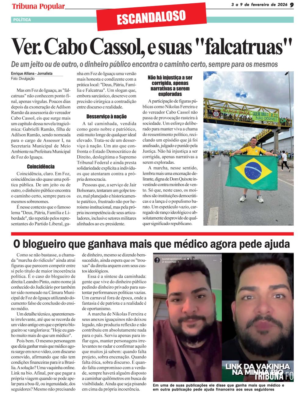 Entre os iguaçuinos que decidiram trocar suas obrigações institucionais por uma caminhada política improvisada está o vereador Cabo Cassol. Eleito para fiscalizar os atos do prefeito General Silva e Luna, Cassol resolveu que o melhor uso do mandato não era cumprir sua função constitucional, mas sim fazer turismo político ideológico, acompanhado de assessores pagos com dinheiro público. Tudo isso com salário garantido: O vereador Cabo Cassol recebeu um salário de R$ 16.724,00 referentes a janeiro de 2026. Fiscalizar o Executivo? Que nada. Marchar atrás de deputado famoso dá mais engajamento.