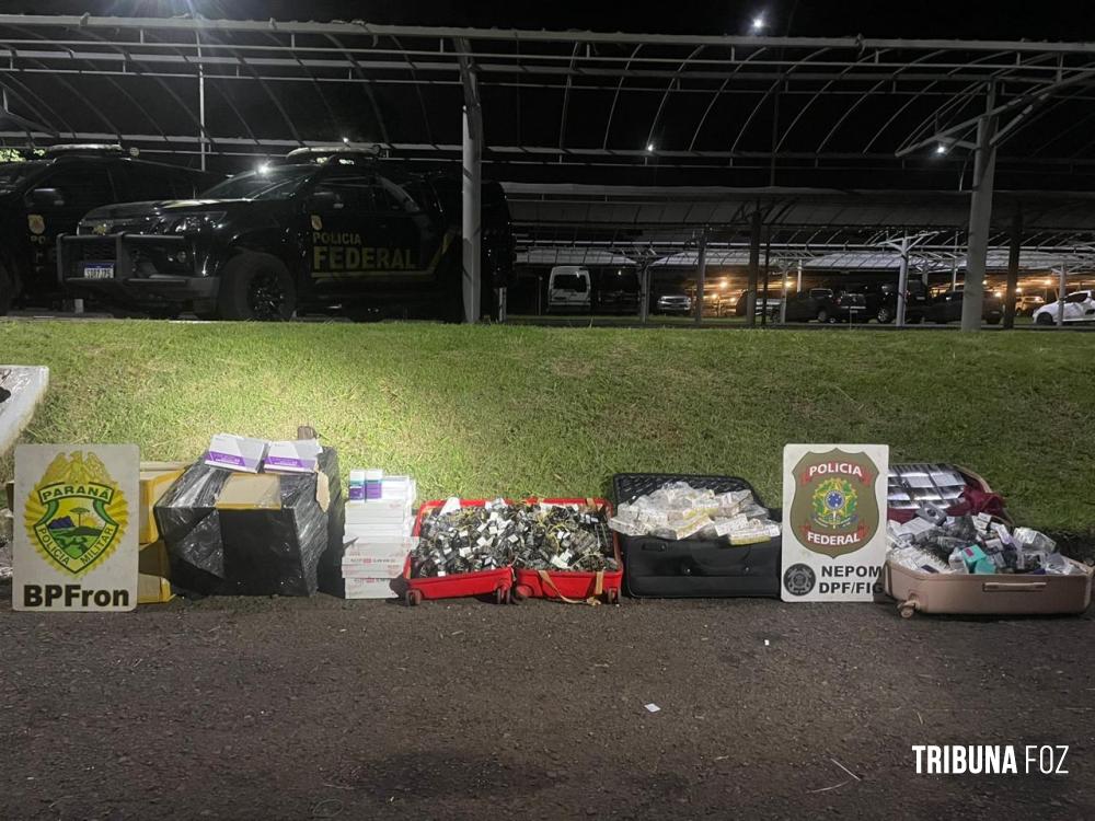 Na noite da última segunda-feira, 13 de abril de 2026, por volta das 20h:30min, uma ação conjunta entre a agentes da Delegacia da Polícia Federal de Foz do Iguaçu e a Polícia Militar resultou na prisão de dois indivíduos e na apreensão de grande quantidade de mercadorias de origem estrangeira na região da fronteira.