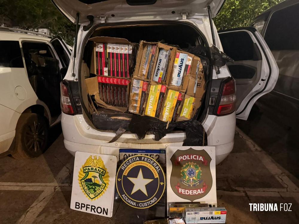 Na primeira ocorrência, registrada no início da noite de segunda-feira (10/02/2026), equipes realizavam fiscalização na região da Ponte Internacional Tancredo Neves, na fronteira entre Brasil e Argentina, quando acompanharam um veículo suspeito e localizaram uma residência utilizada para armazenar cigarros, cigarros eletrônicos e aparelhos celulares. Na ação, três veículos carregados foram apreendidos.