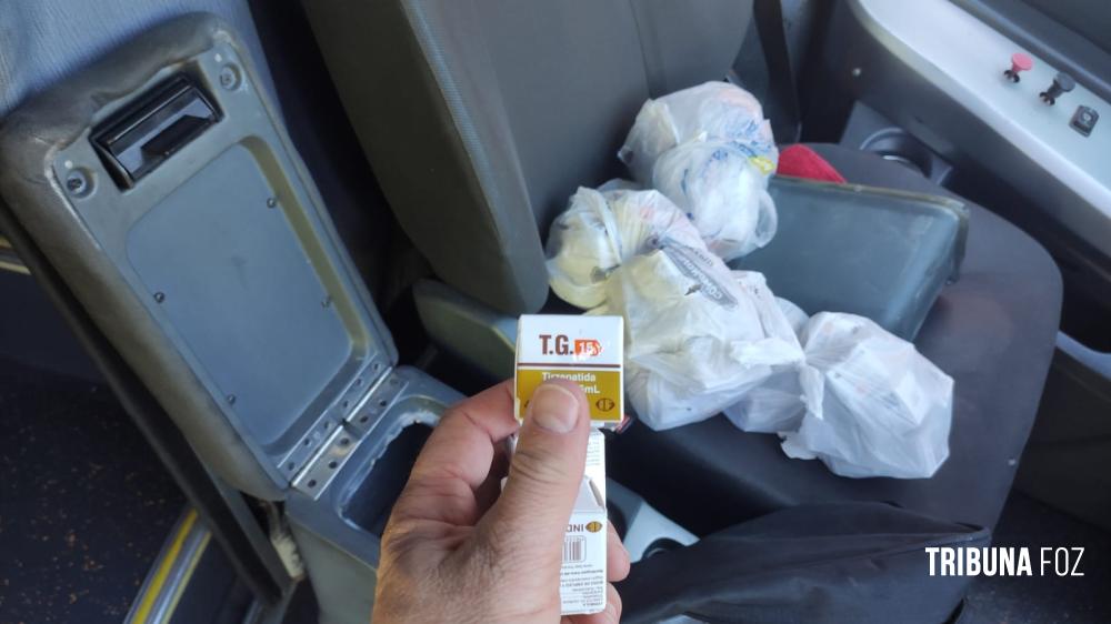 O ônibus era conduzido por um homem que estava sozinho no veículo e demonstrou nervosismo durante a fiscalização. Em inspeção minuciosa, foram localizados, em compartimentos ocultos na área do condutor, diversos produtos de origem estrangeira, entre eles nove aparelhos celulares da marca Apple, modelos iPhone 17 Pro e 17 Pro Max, avaliados em aproximadamente R$ 64 mil, além de 384 ampolas do medicamento Tirzepatida 15 mg, introduzidas de forma irregular no país.