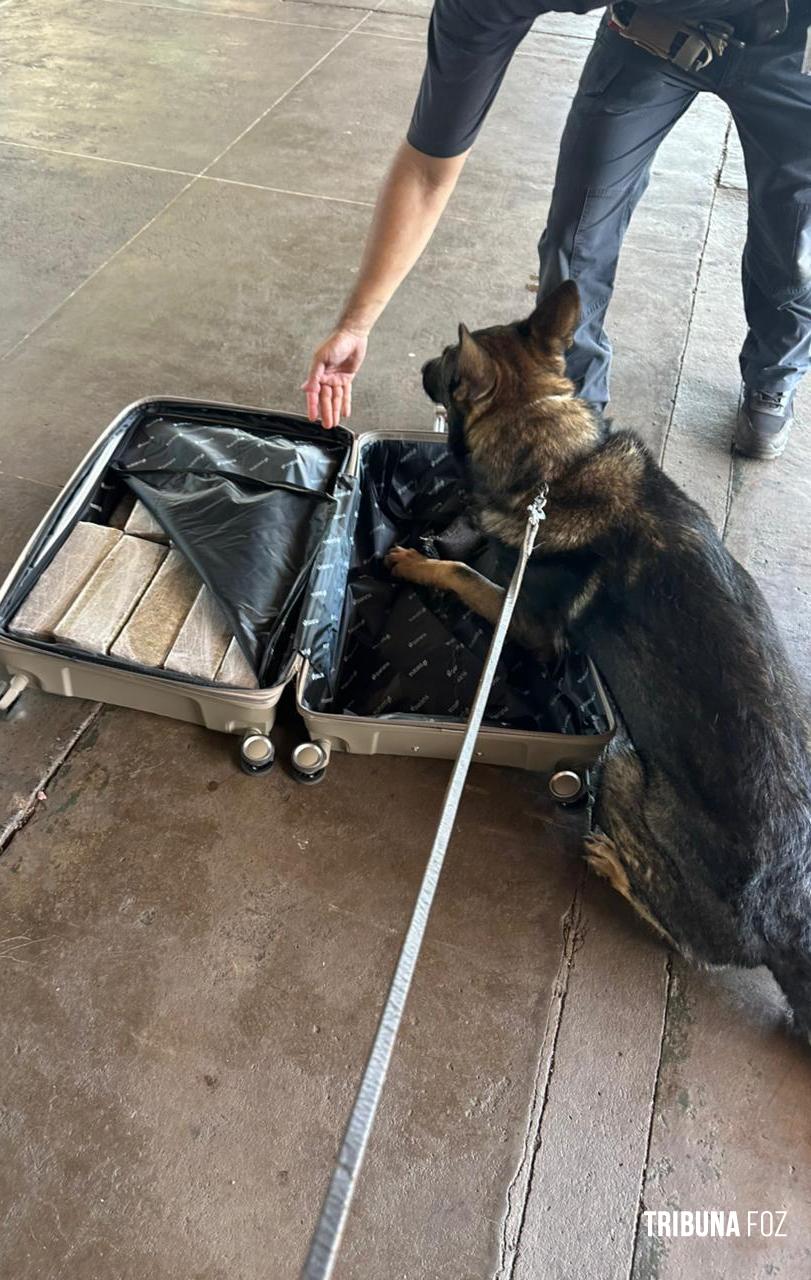 A prisão ocorreu durante fiscalização de rotina, quando cães farejadores da Polícia Federal indicaram a presença de substância entorpecente em uma mala de viagem. Após a verificação, os policiais encontraram diversos tabletes de maconha no interior da bagagem, com peso total de 21,6 Kg da droga.