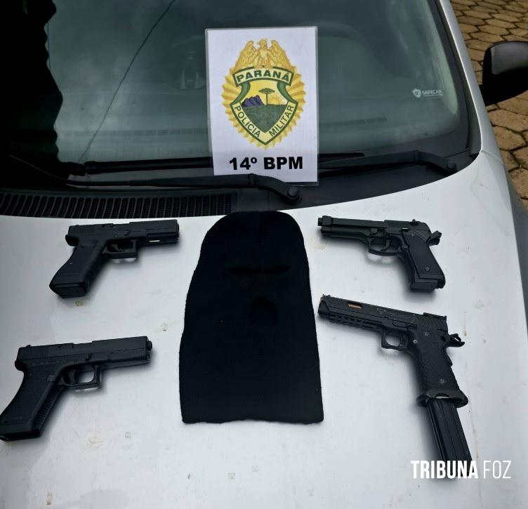 Na tarde de ontem, quarta-feira 1º de outubro de 2025, uma ação integrada de equipes policiais do 14º Batalhão da Policia Militar de Foz do Iguaçu, resultou na prisão de 04 (quatro) indivíduos suspeitos de associação criminosa. Durante a abordagem policial foram localizados quatro simulacros de pistola, uma toca balaclava e constatada a adulteração dos sinais identificadores do veículo utilizado pelo grupo.