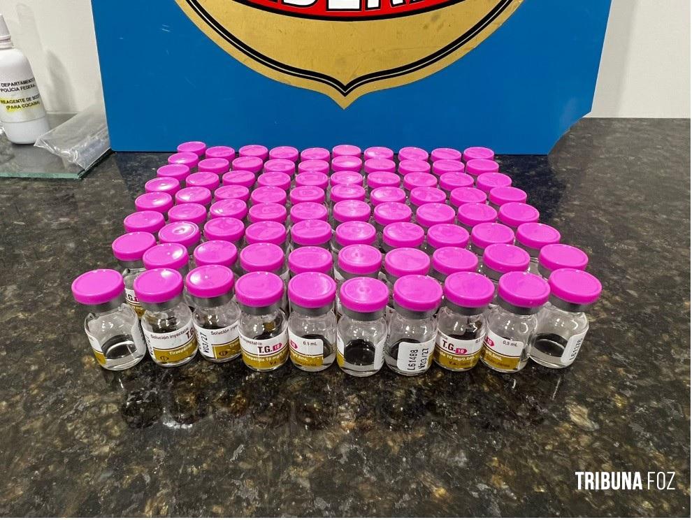 Ante ao exposto os agentes compartilharam as informações levantadas com policiais federais que se encontravam de plantão no Aeroporto, onde após a abordagem policial resultaram na apreensão de 80 (oitenta) ampolas de medicamentos de uso controlado introduzidas ilegalmente no país.