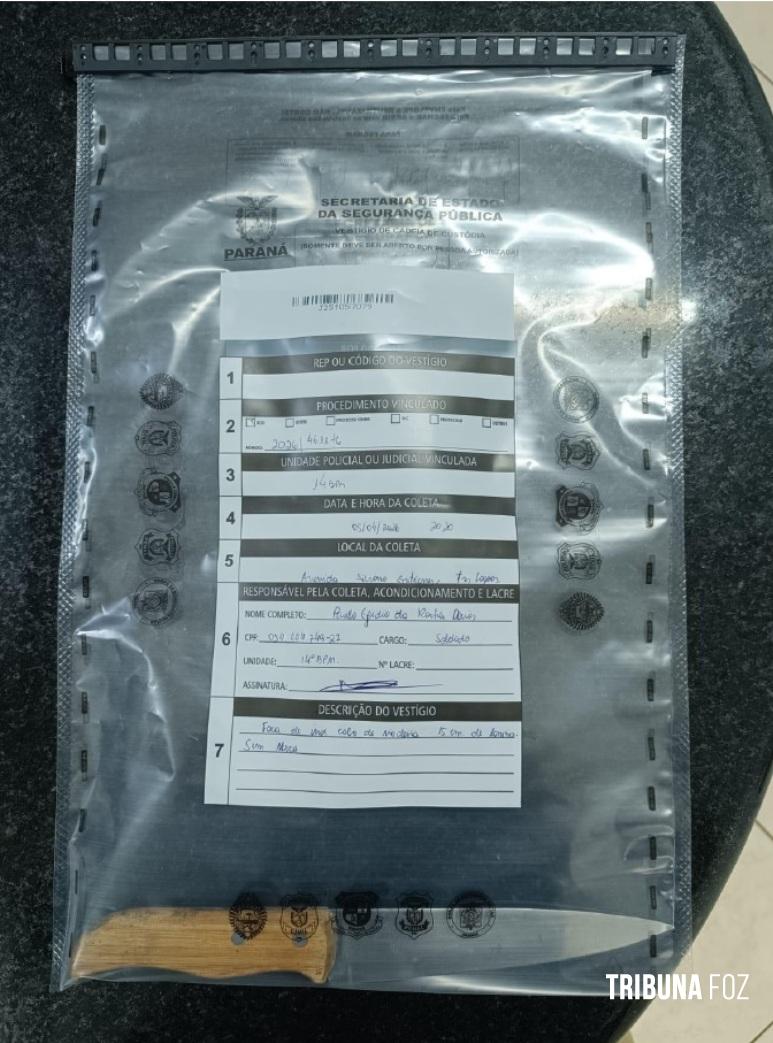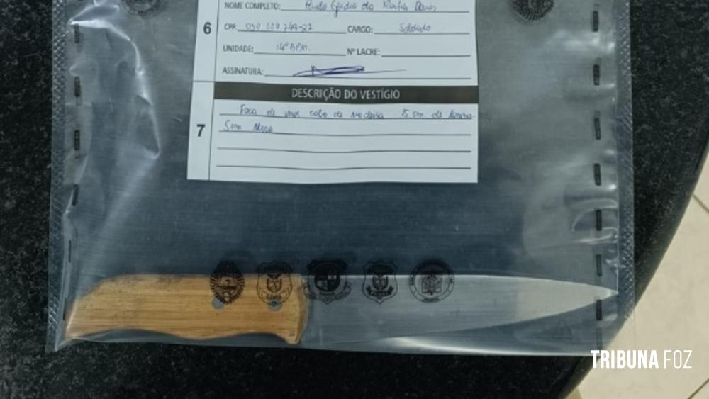 O homem foi algemado conforme a Súmula Vinculante nº 11 do STF e encaminhado, juntamente com a vítima e a faca apreendida, à Delegacia de Polícia Civil, para os procedimentos cabíveis.