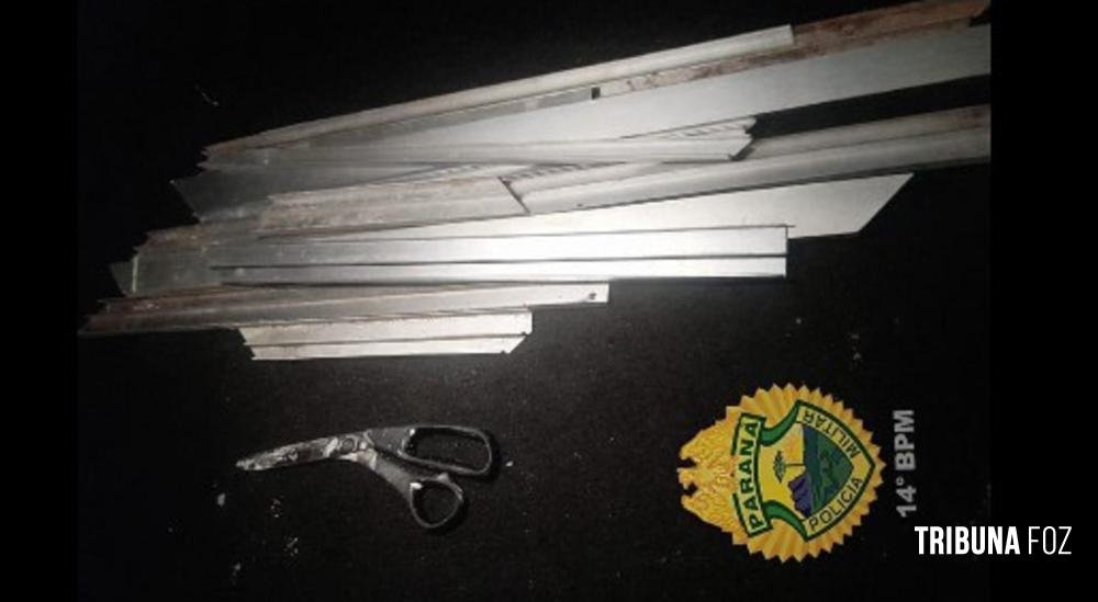 Durante a averiguação, foi constatada a tentativa de furto de uma esquadria de alumínio do banheiro, além de dano ao patrimônio do condomínio. O abordado estava em posse de uma tesoura, possivelmente utilizada na ação.