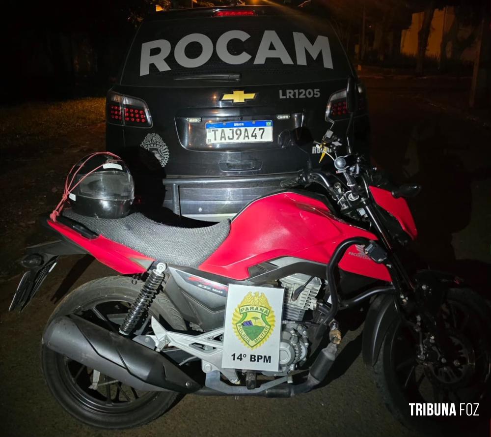 Na noite de ontem, terça-feira 21 de abril de 2026, por volta das 20h:30min, equipes da ROCAM (Rondas Ostensivas Com Aplicação de Motocicletas) da 1ª Companhia do 14º Batalhão da Polícia Militar recuperaram uma motocicleta com registro de roubo no bairro Portal da Foz, em Foz do Iguaçu.