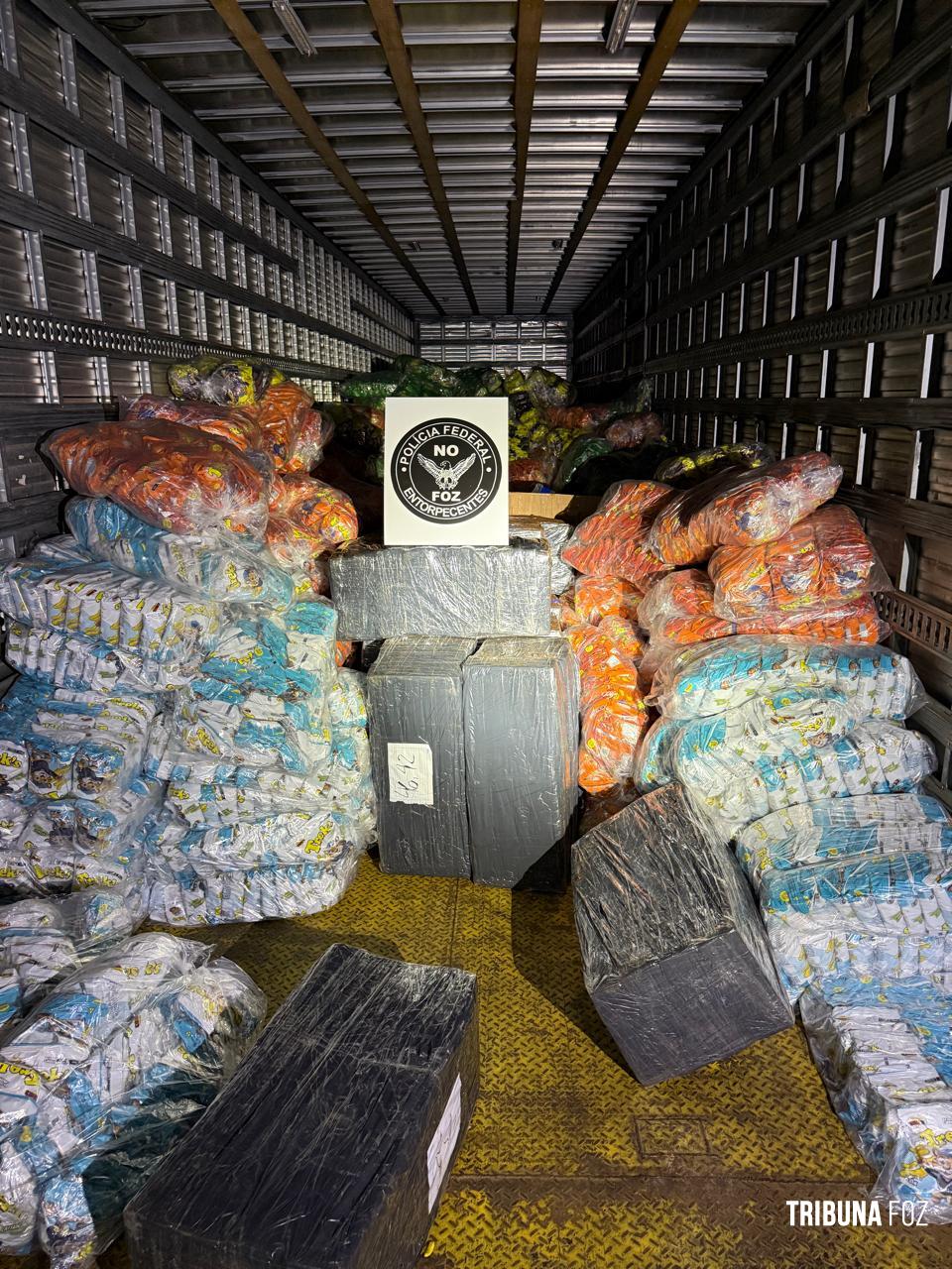 Ao inspecionar a carga, os policiais encontraram diversos fardos de maconha, totalizando aproximadamente 1.214,8 quilos da droga.
