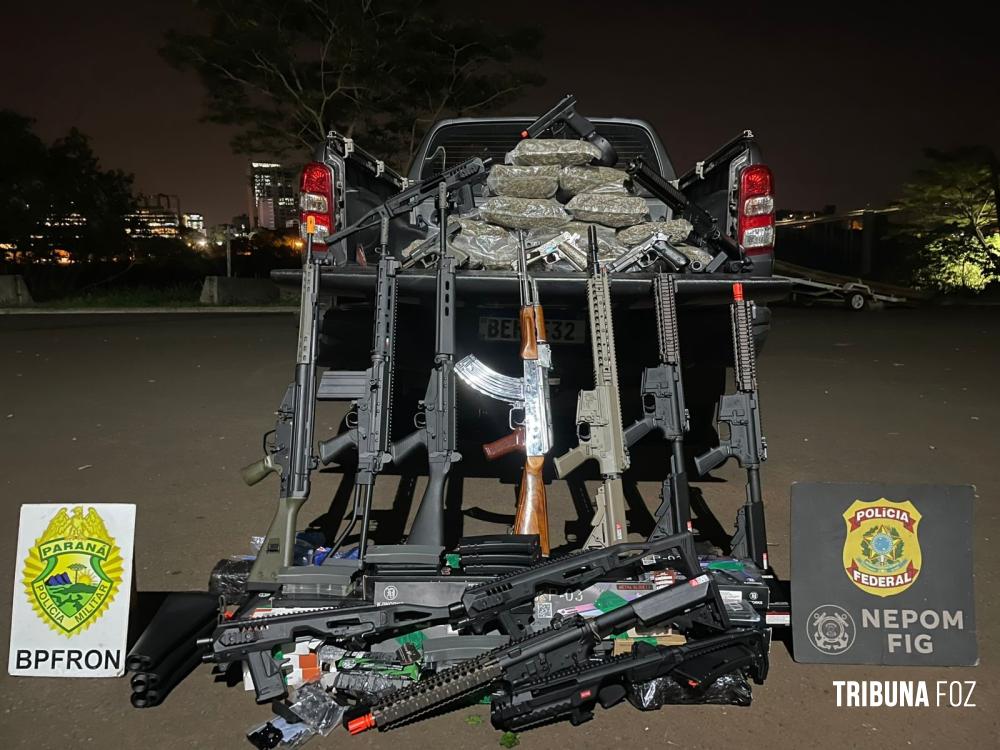 Policia Federal e PM apreendem drogas e simulacros de armas na barranca do Rio Paraná em Foz do Iguaçu