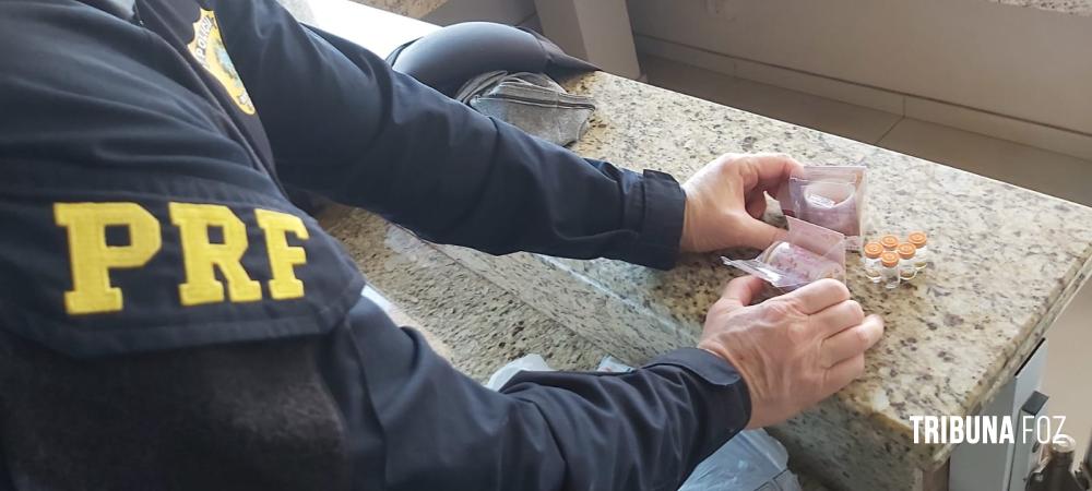 Com uma das passageiras, os policiais também encontraram oito ampolas do medicamento Tirzepatida, ocultas no interior de dois rolos de adesivos infantis.