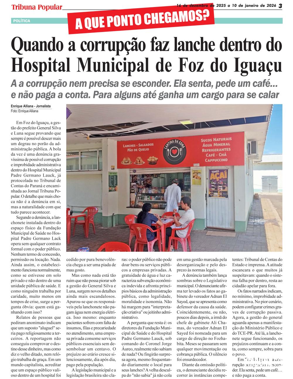 Em Foz do Iguaçu, a gestão do prefeito General Silva e Luna segue provando que sempre é possível descer mais um degrau no porão da administração pública. A bola da vez é uma denúncia gravíssima de possível corrupção e improbidade administrativa dentro do Hospital Municipal Padre Germano Lauck, já protocolada no Tribunal de Contas do Paraná e encaminhada ao Jornal Tribuna Popular. O detalhe que mais choca não é a denúncia em si, mas a naturalidade com que tudo parece acontecer.