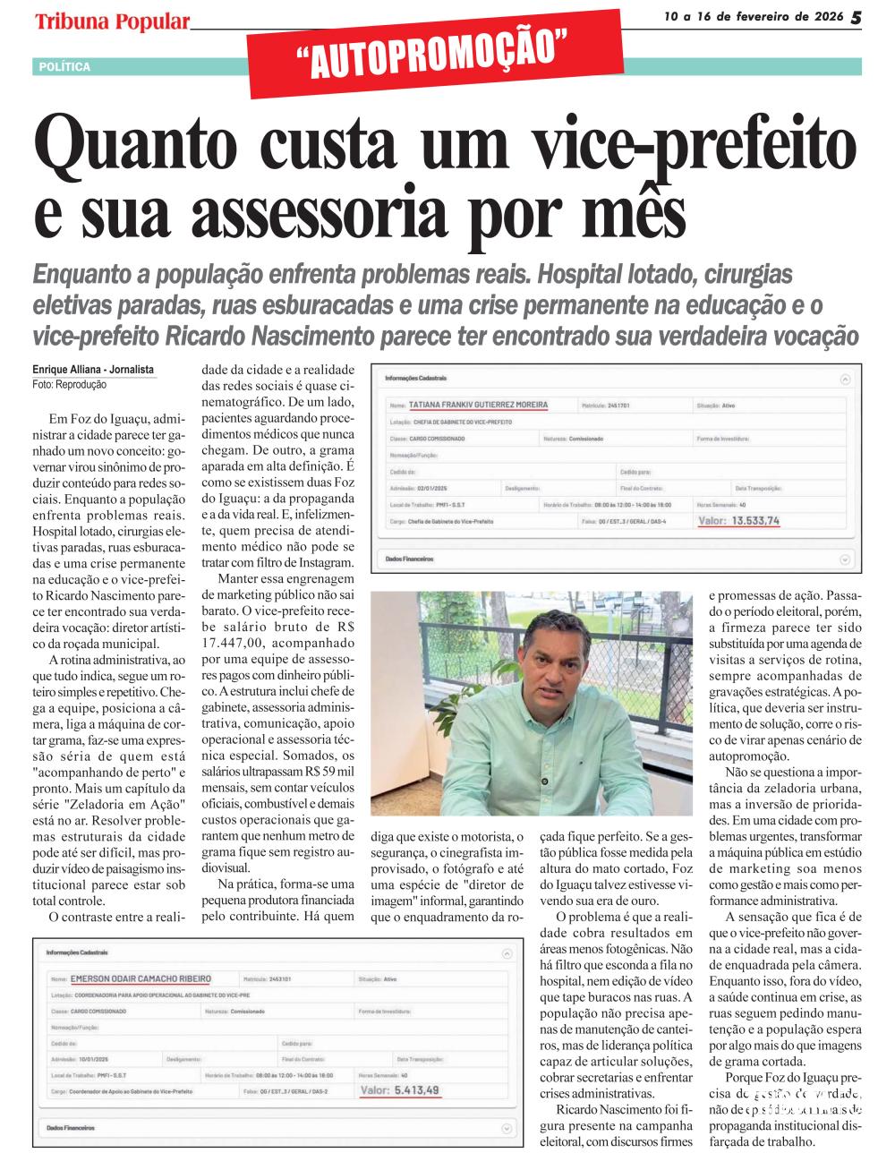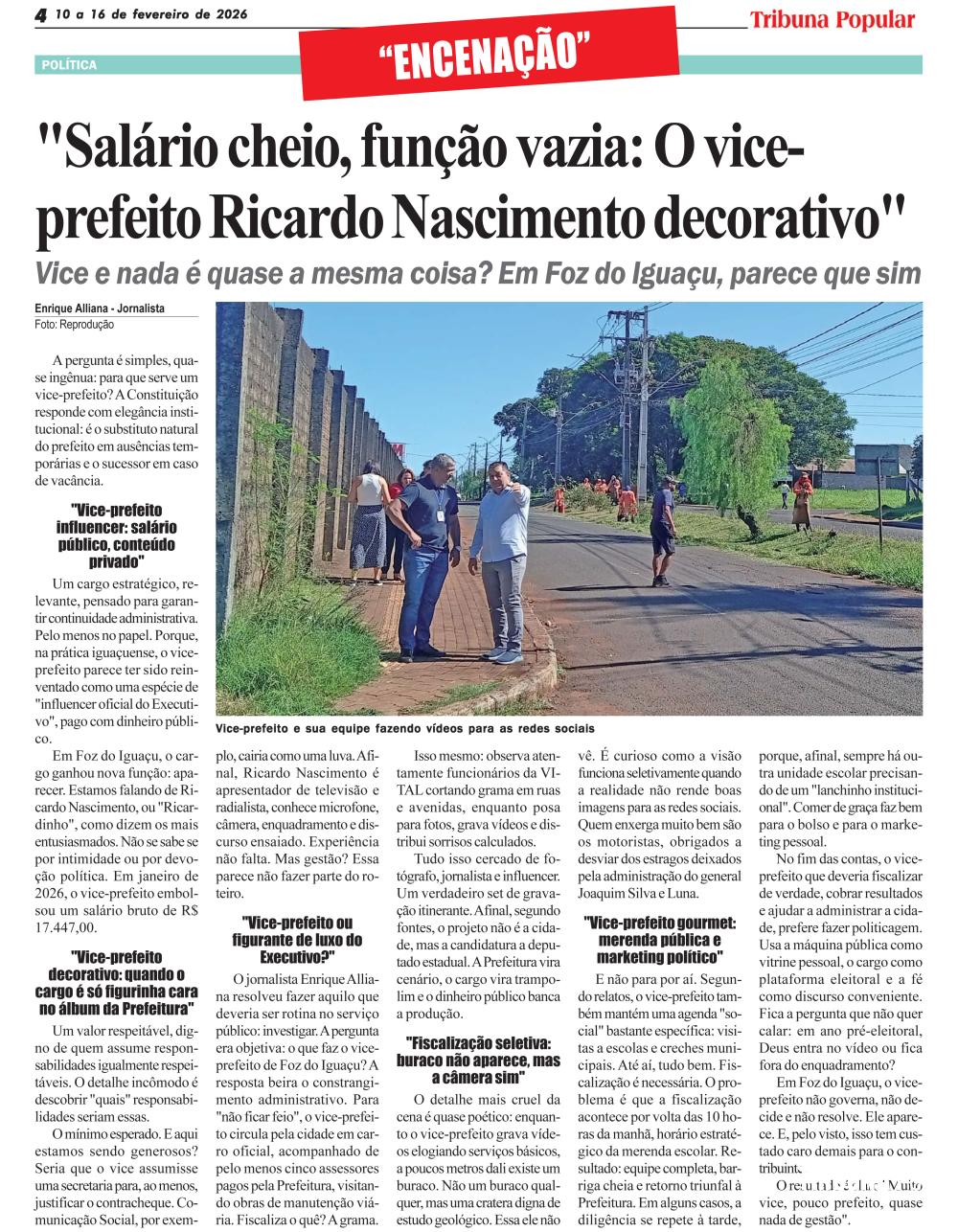 Em Foz do Iguaçu, o cargo ganhou nova função: aparecer. Estamos falando de Ricardo Nascimento, ou "Ricardinho", como dizem os mais entusiasmados. Não se sabe se por intimidade ou por devoção política. Em janeiro de 2026, o vice-prefeito embolsou um salário bruto de R$ 17.447,00.